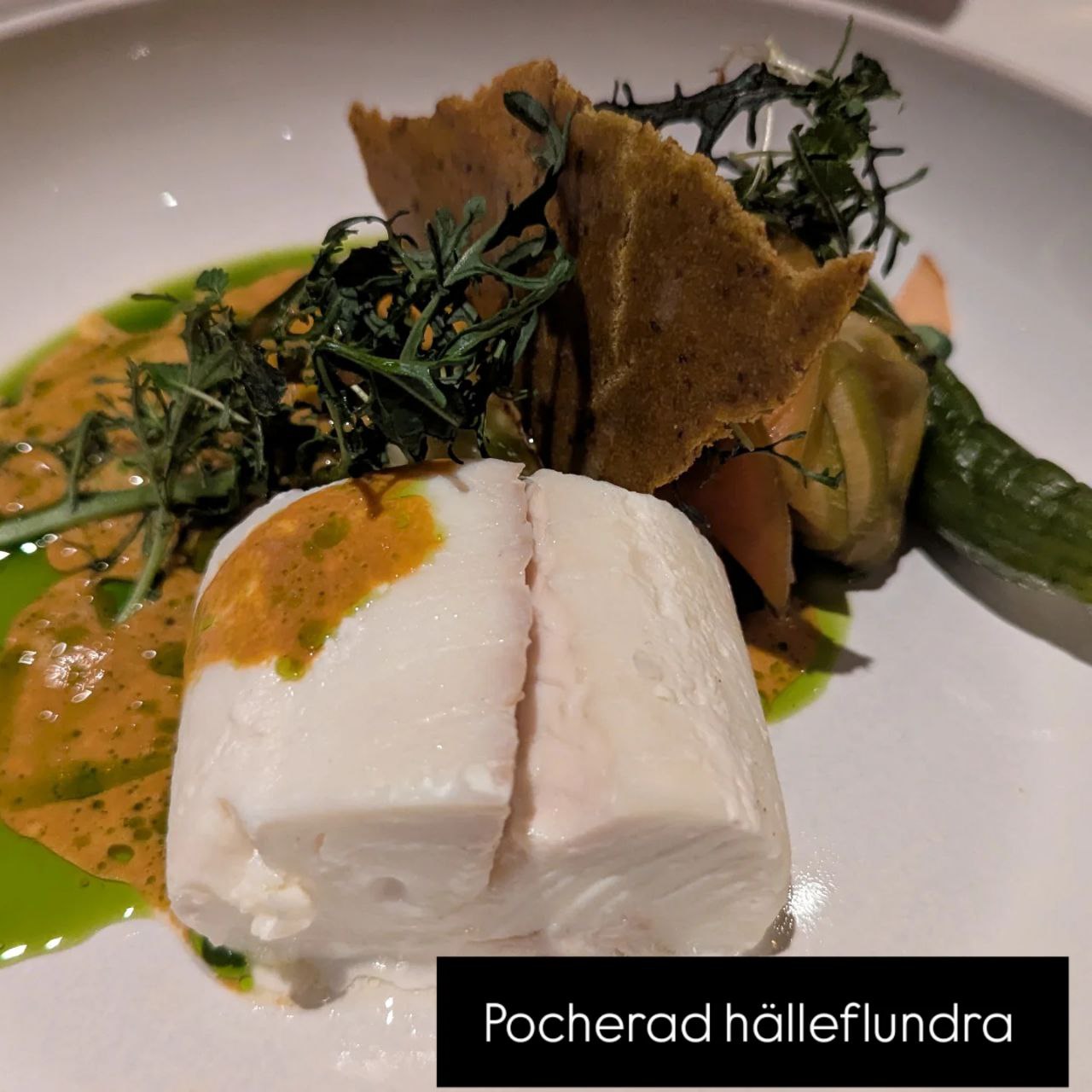Tyvärr förändrades allt när den fjärde rätten serverades. Den pocherade hälleflundran var något av det torraste jag någonsin ätit. Den serverades dessutom av en ung man som nästan snärjde in sig i gardinen för att servera mitt sällskap från höger sida invid fönstret trots att det egentligen inte fanns plats. När vår huvudservitör frågade om rätten var till belåtenhet nämnde jag att fisken var en aning torr. Han svarade att han skulle ta det med köket. Tyvärr upplevde vi att stämningen därefter förändrades. Han var mycket kort vid de fortsatta kontakterna under kvällen.
