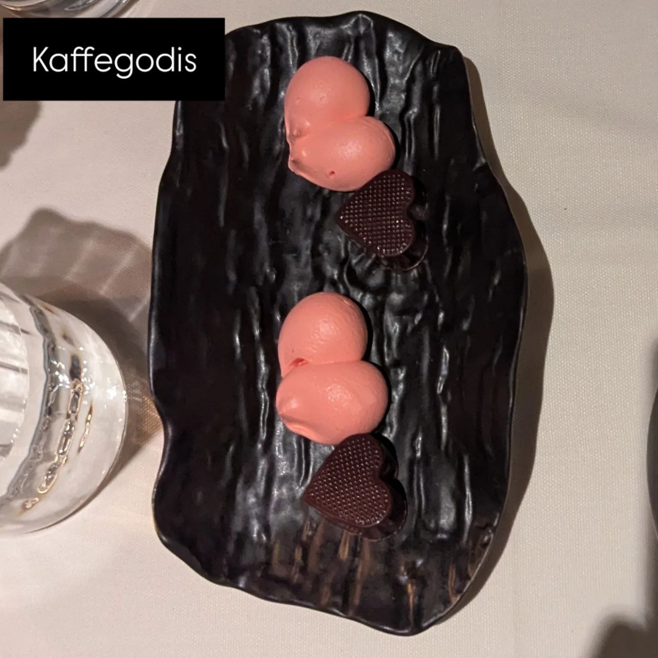 Slutligen serverades en chokladpralin, som såg ut att vara tagen ur en Marabouask, tillsammans med en maräng och en gåtfull gaffel. Vi kunde inte riktigt förstå tanken med gaffeln eftersom det hade varit svårt att använda den.