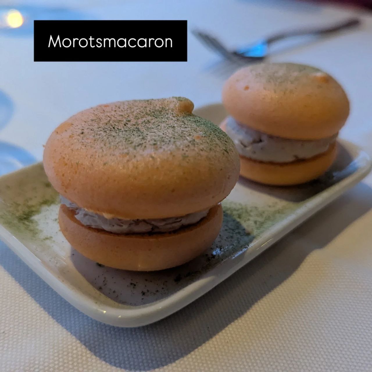 Den första rätten var en morotsmacaron med vispad anklever och sultanarussin. Jag får erkänna att det var med viss tvekan vi tog oss an den. Lever är inget som normalt tilltalar och vi brukar skämta om tupplevermoussen som serverades på Aira. Kombinationen morotsmacaron och anklever fungerade tack och lov riktig bra. Allt väl så långt.