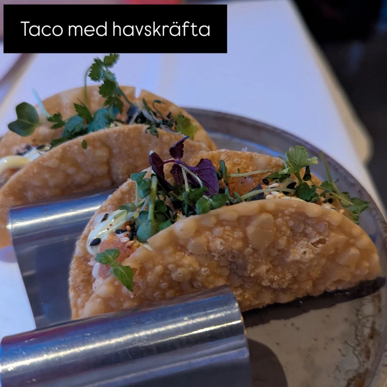 Rätt nummer två vittnade tyvärr om att alla detaljer inte var så genomtänkta. En hållare med två havskräftetacos placerades mitt på bordet. Problemet var att det droppade av dessa tacos när de lyftes. Det blev en del kladd på duken av att äta dessa. De hade behövt serveras individuellt på en tallrik för gästen att hålla sig över.